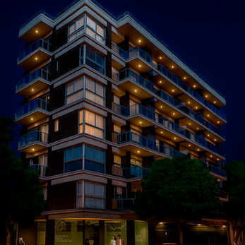 Casa Bamba destaca por su claridad compositiva y su integración equilibrada con el entorno urbano. El proyecto se estructura a partir de una volumetría limpia, con balcones corridos, barandas de vidrio y hormigón, que refuerzan la horizontalidad y aportan transparencia y liviandad a la fachada. La planta baja se resuelve con una entrada jerarquizada, materiales nobles como mármol negro, y una cuidada iluminación que acompaña el recorrido desde el ingreso hasta el núcleo de circulación vertical. Los espacios comunes fueron pensados como extensiones del habitar, con diseño funcional, identidad y calidez. En los niveles superiores, las unidades priorizan la iluminación natural y las visuales abiertas, incorporando carpinterías de piso a techo, amplios balcones y terminaciones modernas. La terraza, con vistas panorámicas, extiende el uso social del edificio y refuerza el vínculo con el paisaje urbano. Casa Bamba representa una propuesta contemporánea, sólida y funcional, en diálogo con el contexto y enfocada en la calidad del habitar cotidiano.